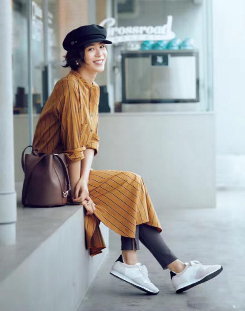 暖色系的條紋襯衫裙,彷彿在一個瞬間就趕走了秋日清冷。橘色+棕色的條紋,讓陣陣暖意湧上心頭,疊搭小腳褲來穿着,利落不邋遢。