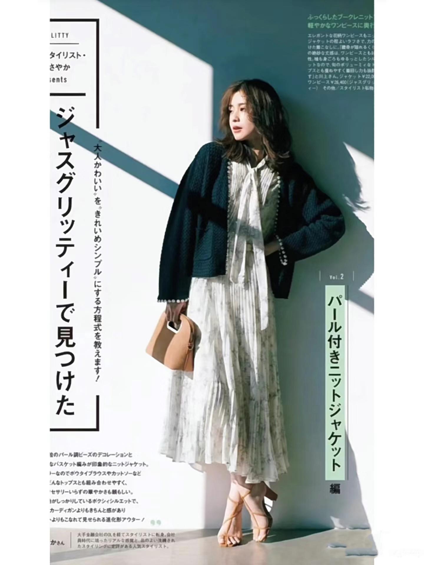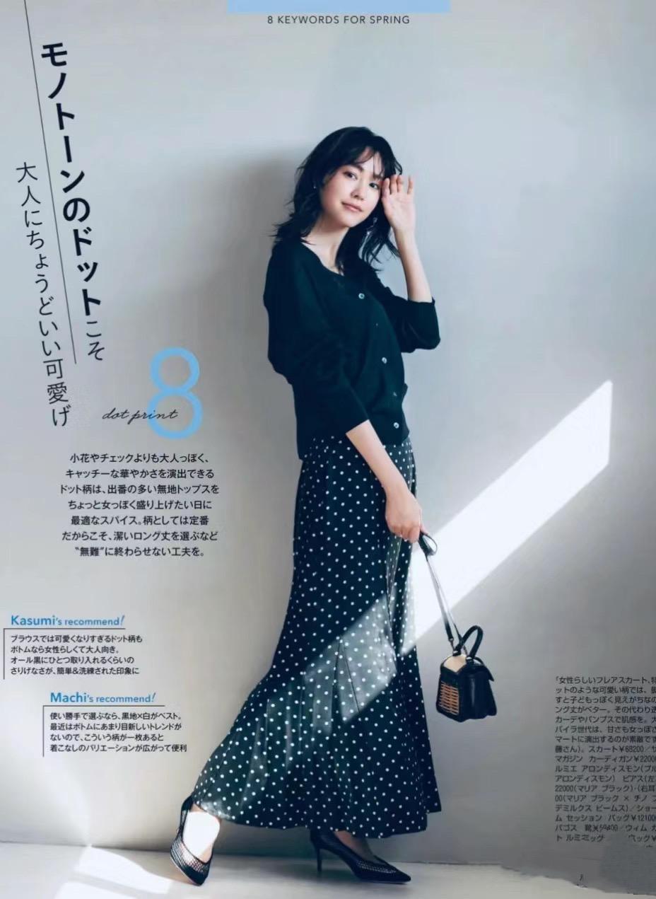 及踝長度的波點魚尾裙,既浪漫又溫柔,腰臀曲線的呈現、也是綻放出靚麗風采。像這種波點的半身裙,搭一件短款的針織開衫,就滿足了秋日期待。