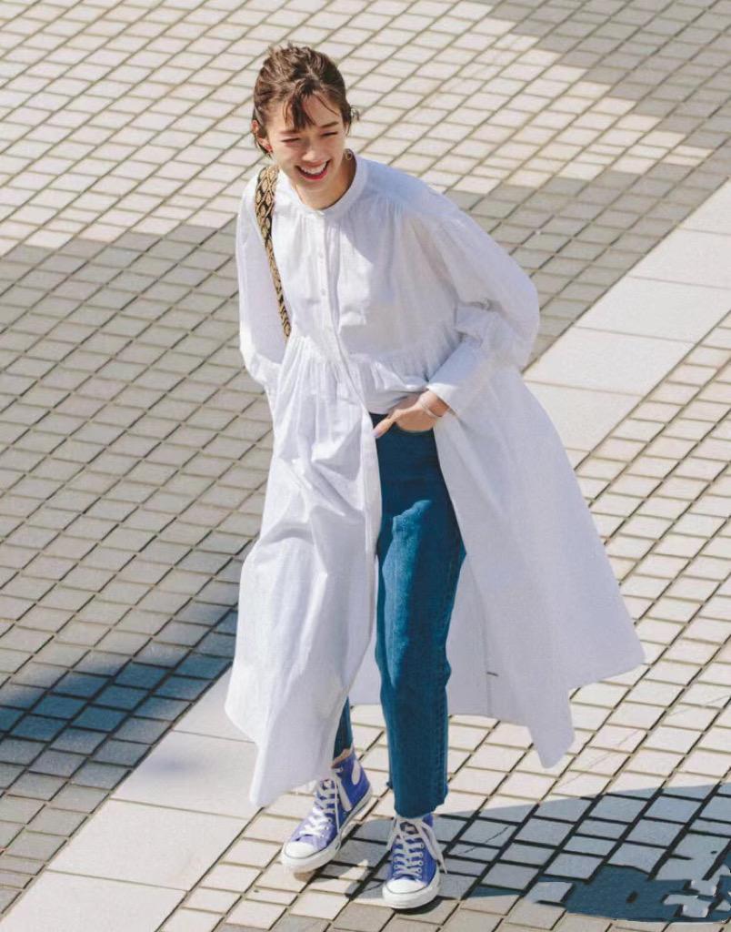 簡簡單單的白色襯衫裙,要怎麼穿纔可以活力四射?寬鬆的白色襯衫裙,配直筒的牛仔褲就對了。牛仔褲修身款式,勾勒出纖細雙腿,時髦且顯瘦。