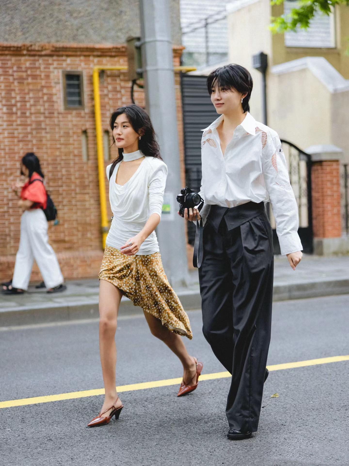 上海街拍,可以隨性舒適、也可以時髦洋氣,鬆弛又自信。白襯衫、闊腿褲,是酷颯拉風的。而白色蕩領上衣+不規則剪裁半身裙,就是洋氣性感的。