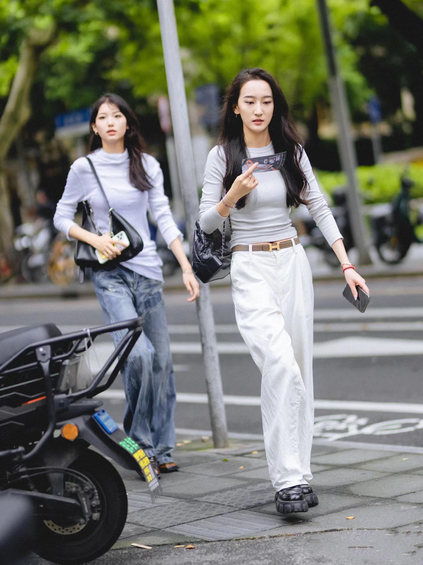 早秋時節,穿一件修身的打底衫,配上高腰的白色直筒褲,上緊下松的搭配,曼妙挺拔的身姿,真的是好醒目。