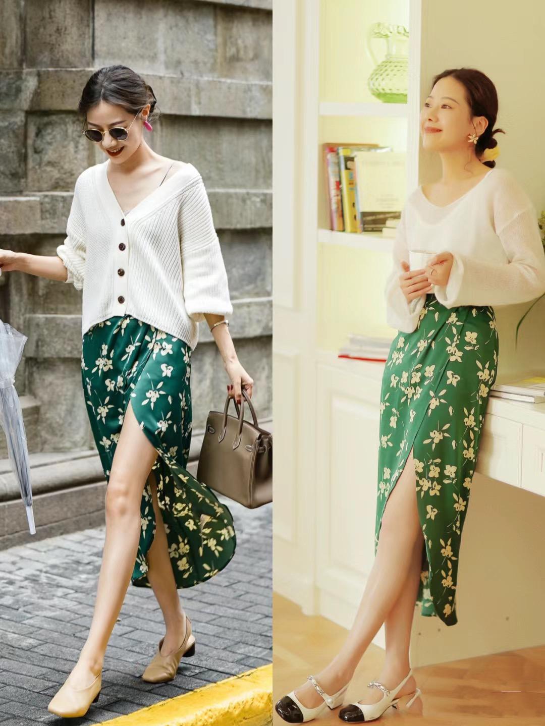 這時候純色+印花,就是雅而不俗的組合。印花的開叉半身裙,配純色系的針織衫,溫柔浪漫。印花半身裙的穿搭,優雅又清爽。