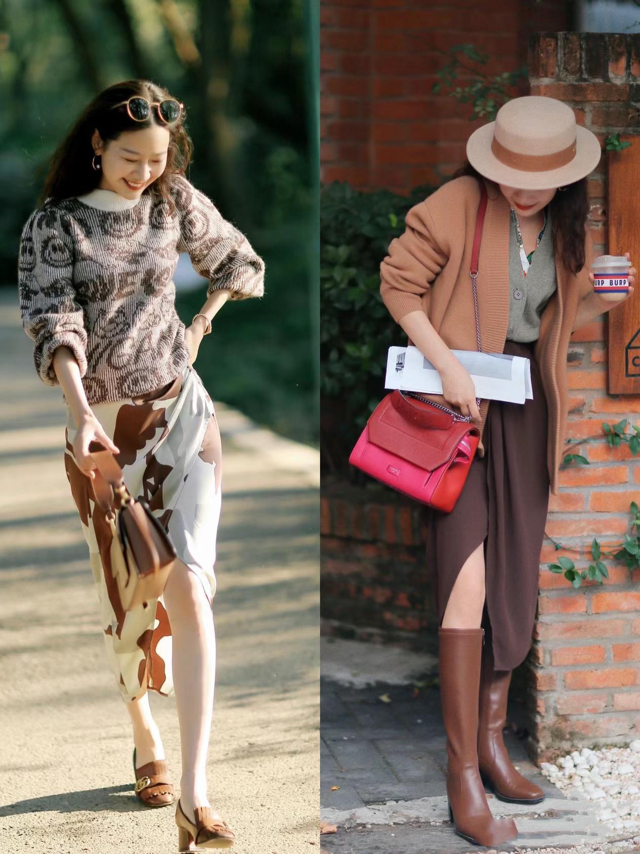 比如棕色開叉半身裙,搭配打底衫的開衫、棕色長靴,就有一種溫暖又低調的美。棕色開叉半身裙+棕色長靴,也是簡潔提氣質。