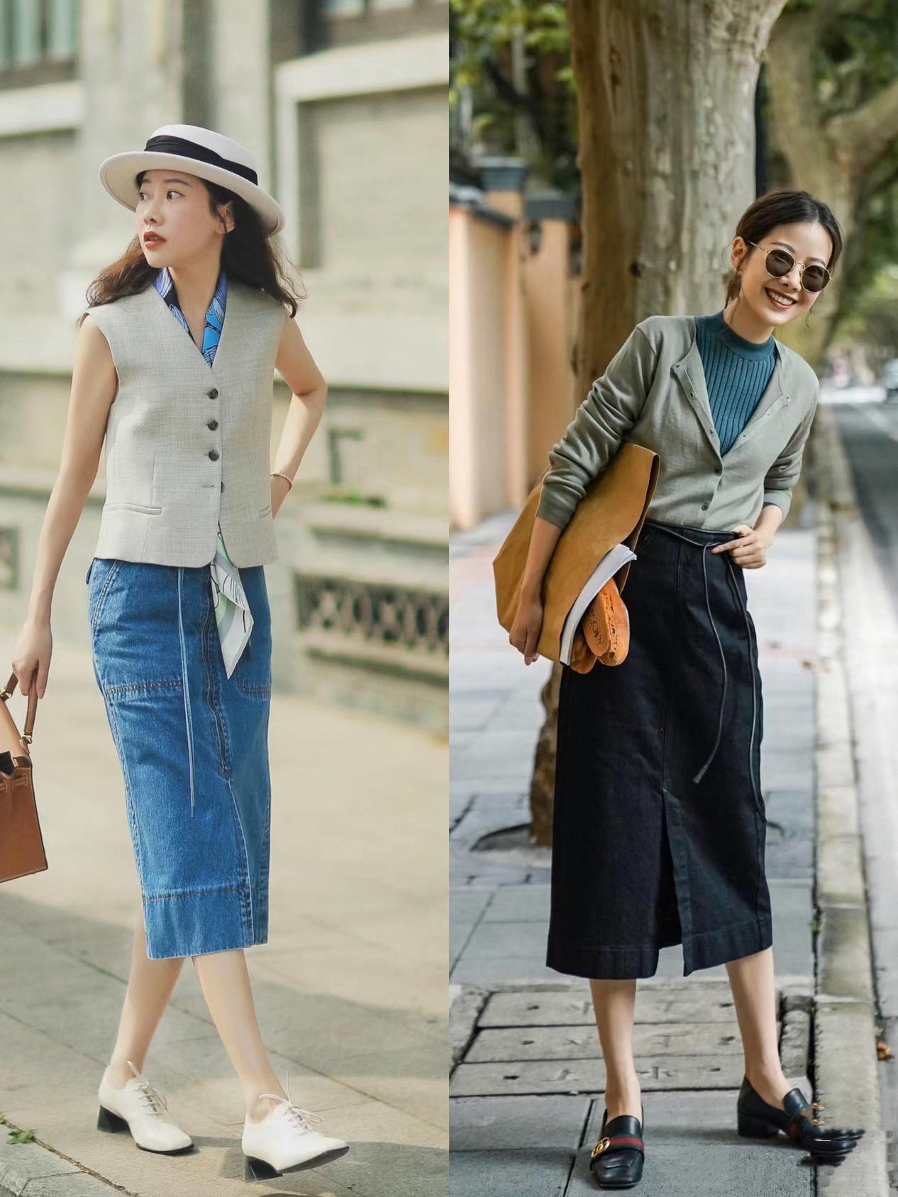 用軟糯針織衫/打底衫來搭配牛仔半身裙,就形成了面料上的軟硬對比。牛仔半身裙包容下半身少許的豐滿,修飾身形還很顯瘦。