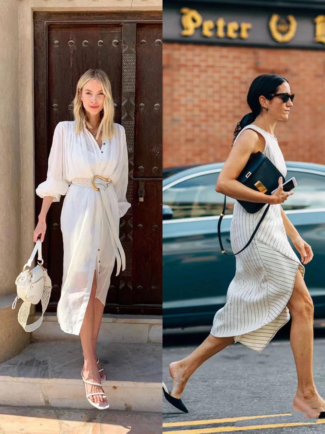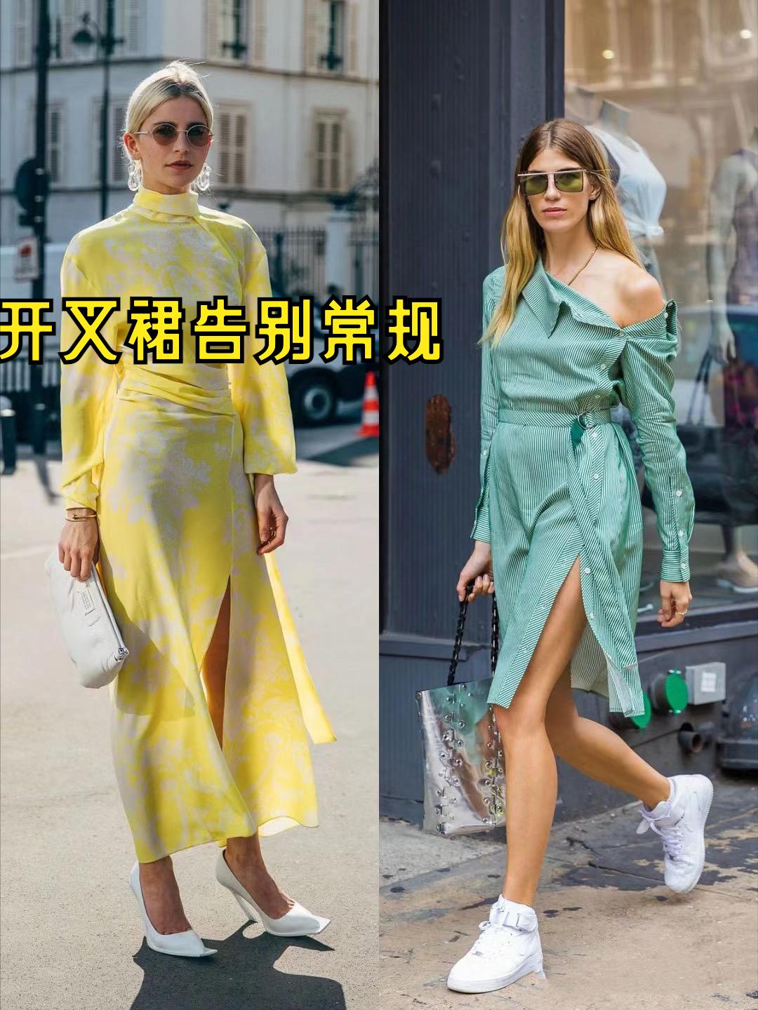比如一條條紋襯衫裙、或者印花連衣裙,增加下襬開叉後瞬間變得風情萬種起來,舉手投足都是撩人的女人味。