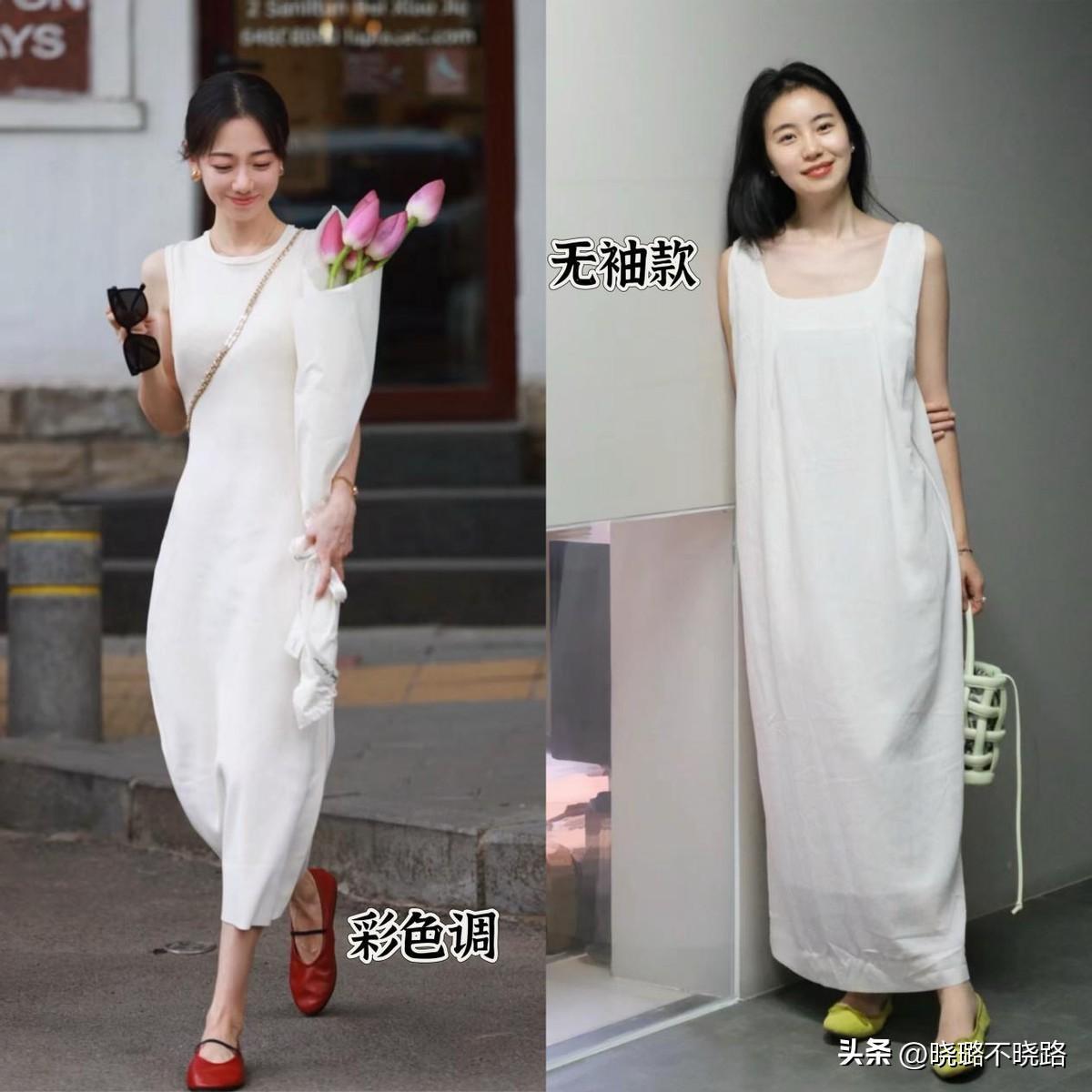白色裙子的設計感不能太複雜,露膚面積也要集中在上半身,像這種無袖款式的及踝小白裙,搭配亮彩色的奶奶鞋,就能讓人眼前一亮。