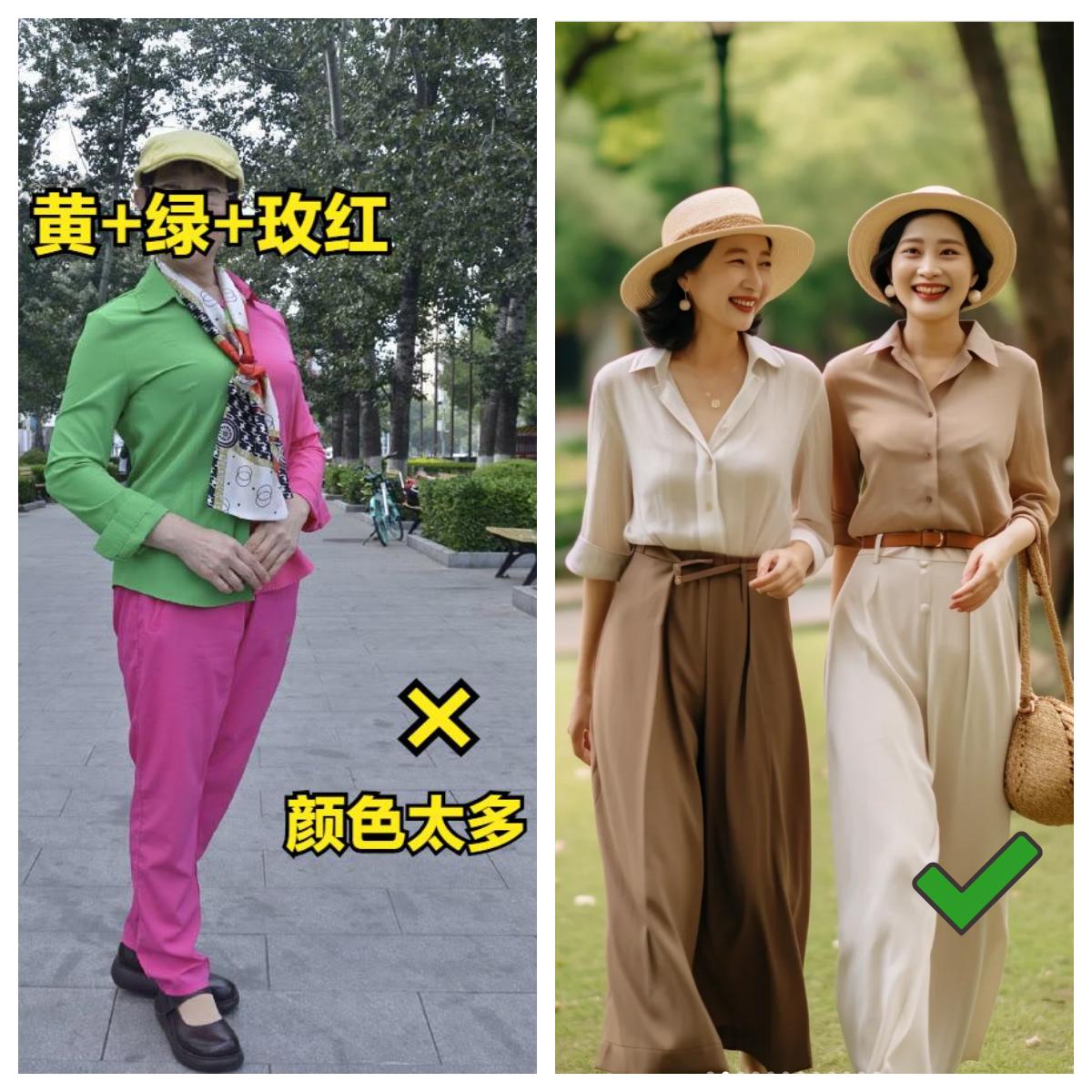 50+女性不知道對色彩是不是有什麼執念,總是喜歡用花哨的顏色來點綴自己,殊不知當你的色彩穿不對的時候,真的很誇張。在一套搭配中,儘量控制色彩數量,避免過多顏色的混搭導致視覺混亂。一般來說,3-4種顏色已經足夠。
