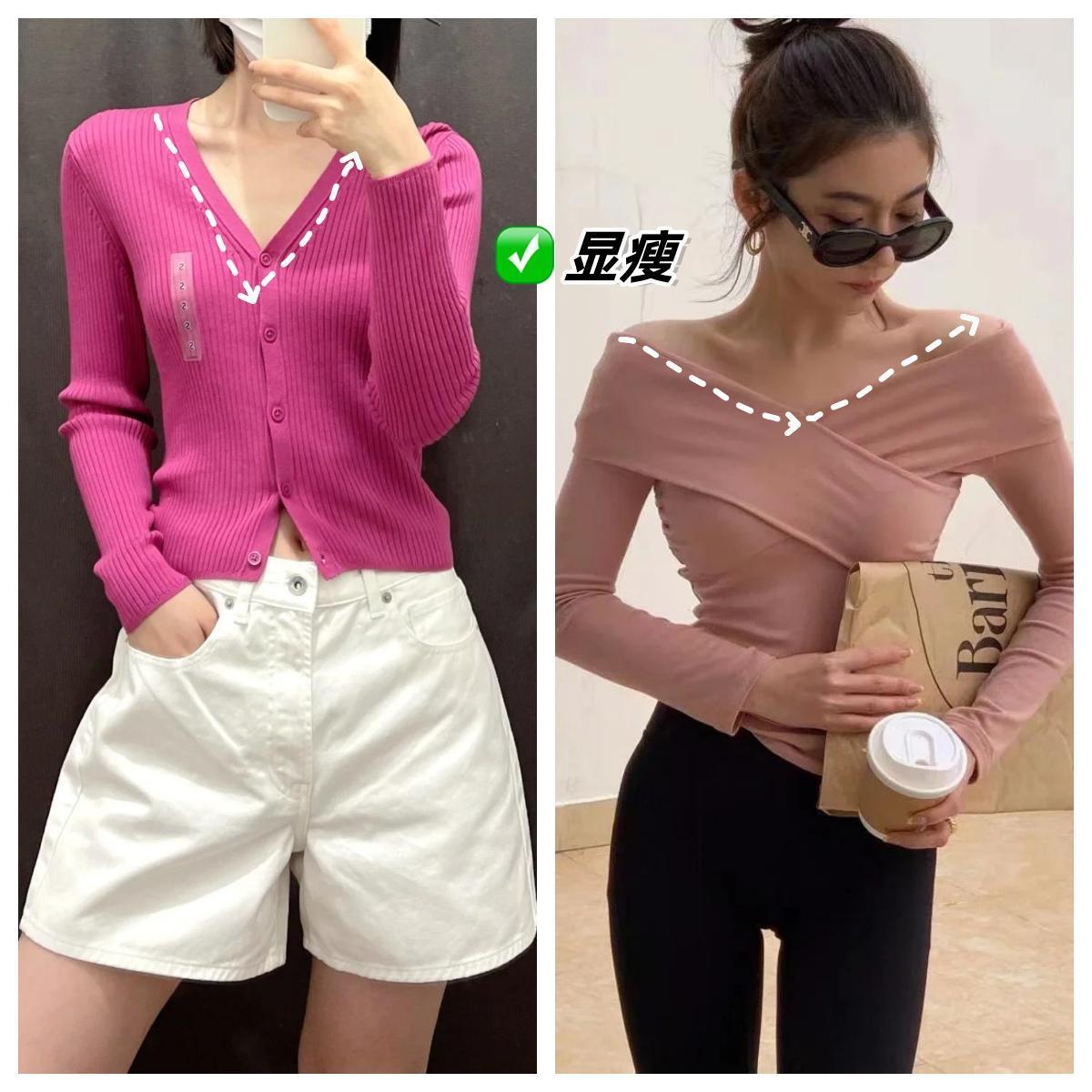 選擇 V 領或 U 領上衣:拉長頸部線條,讓上半身看起來更加修長和苗條。比如V 領上衣+闊腿褲、A 字裙或傘裙,拉長腿部比例,讓身材看起來更加高挑。