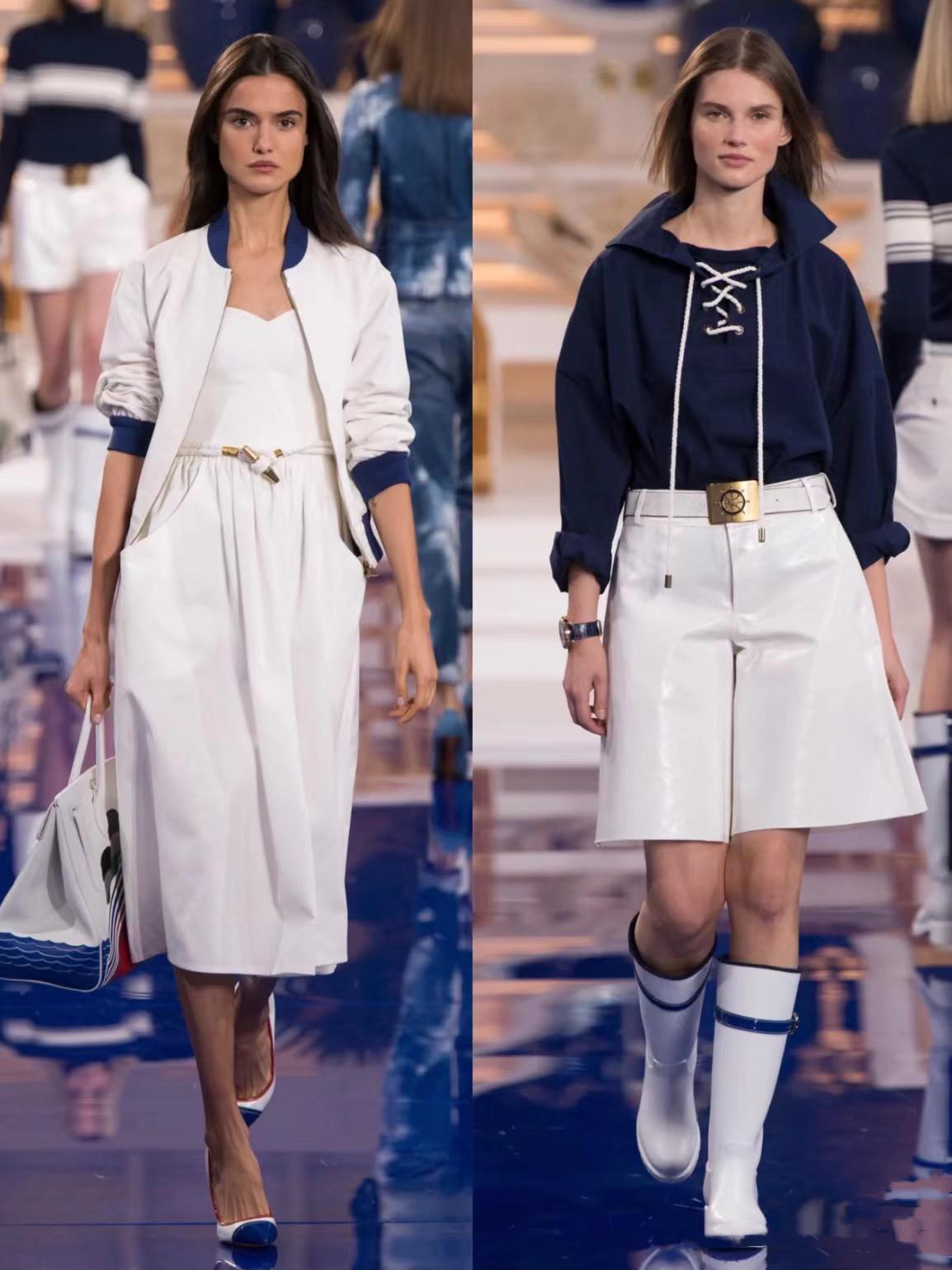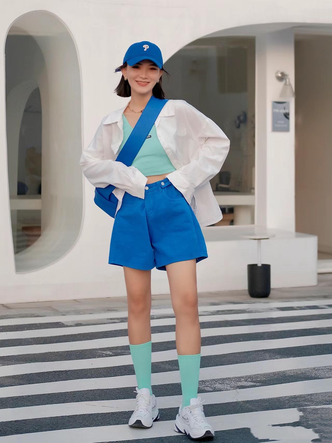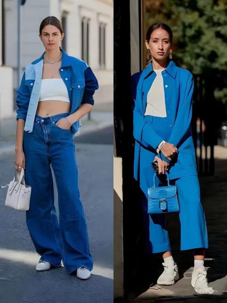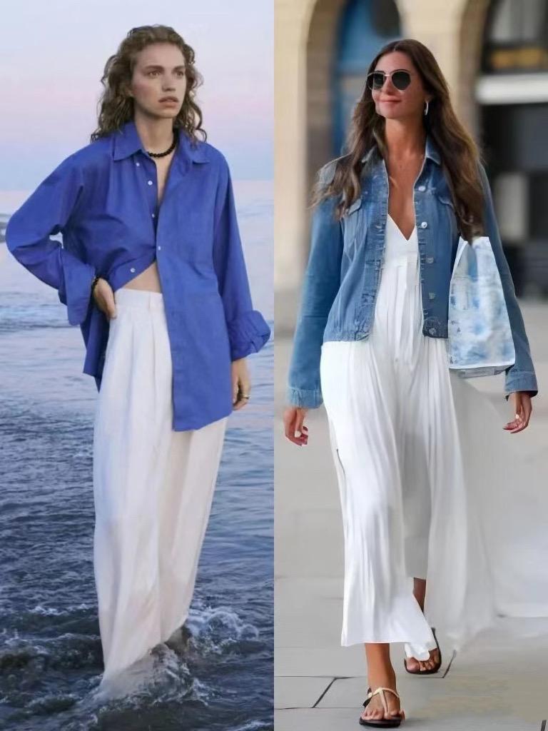 當我們選擇“藍+白”的配色時,儘量不要五五分。我們可以嘗試三七比例的風格,能更自然的修飾身材、顯腿長。