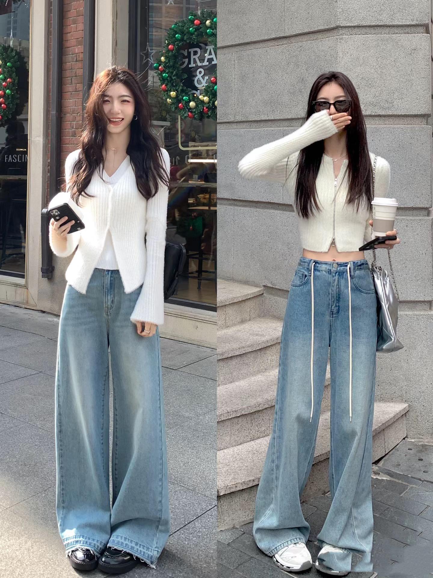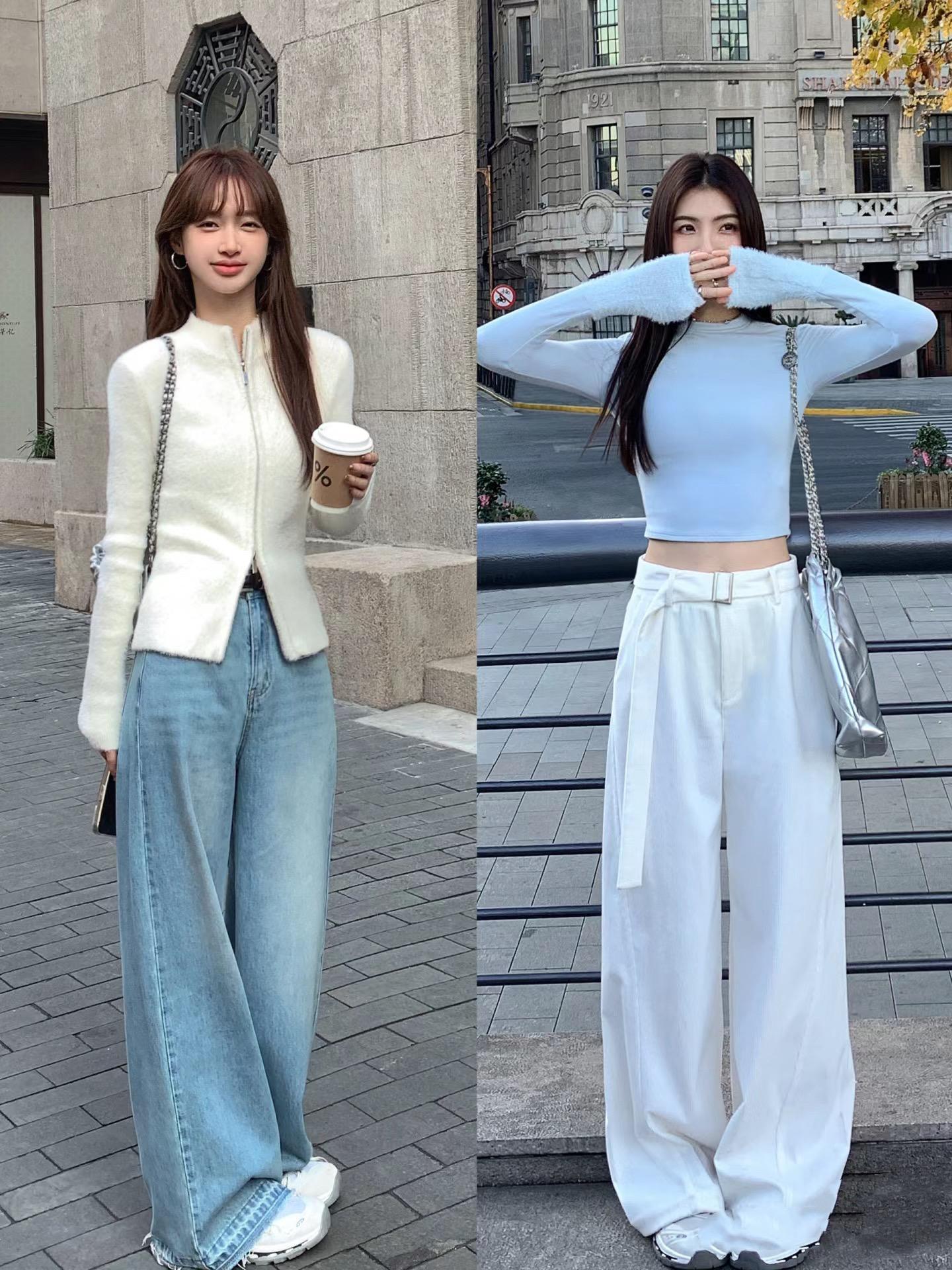 露臍款的針織衫+高腰的闊腿褲,乾淨柔和的藍白配色,帶着韓系辣妹風,瞬間凹出大長腿。