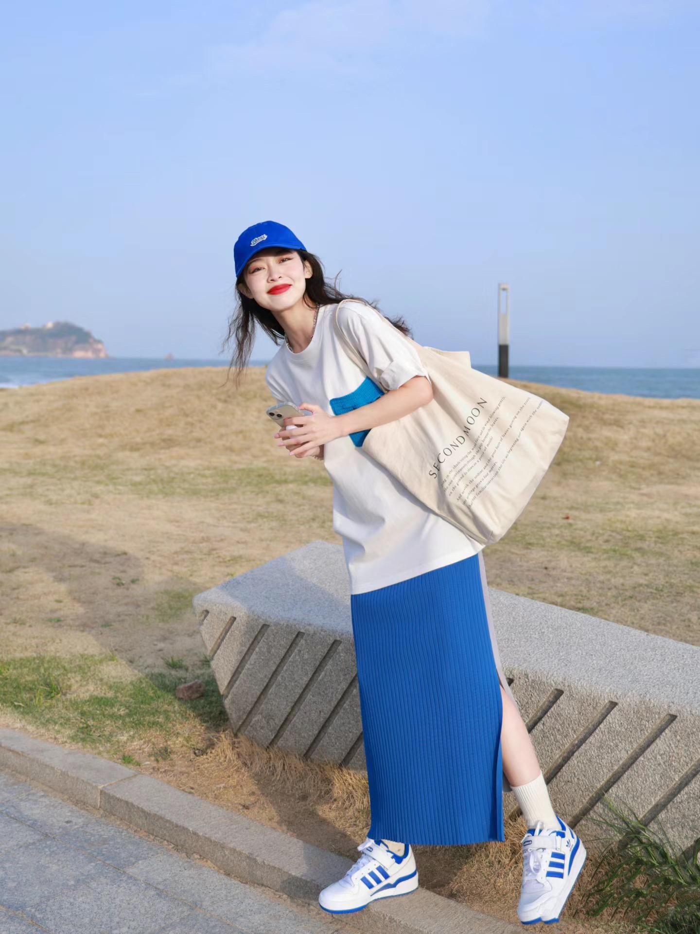 澄澈的藍,與乾淨的白,纔是天生一對。就像藍天白雲一般,裝點了彼此。白色T恤與藍色針織裙的搭配,讓人憶起青澀時光的懵懂少年。