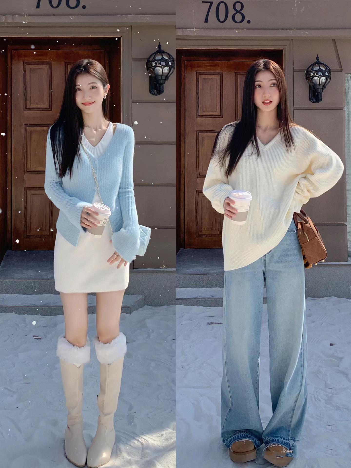 淺藍色針織衫配白色背心裙,或者白色針織衫配淺藍色牛仔褲,都是分外甜美的、有一種清新俏皮的活力範。