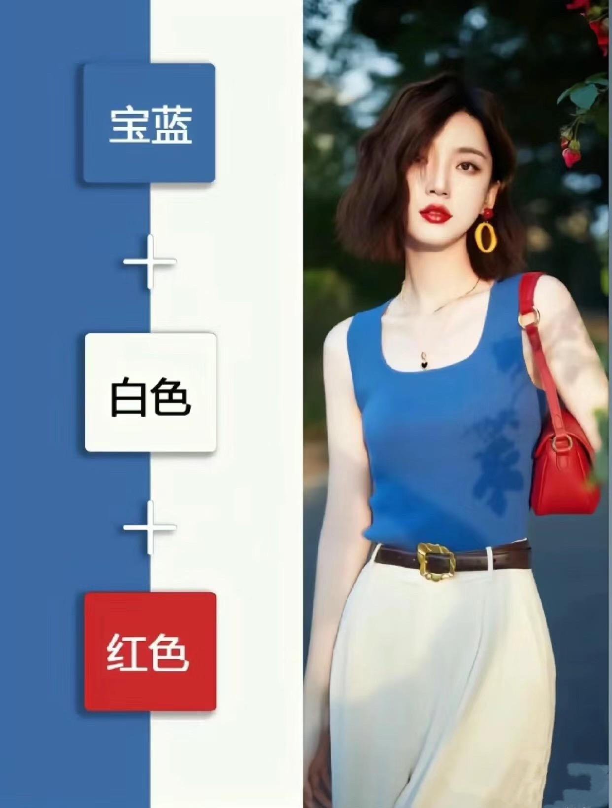 寶藍+白色+紅色,就是一種復古港風的穿搭。寶藍色小背心+白色闊腿褲+紅色腋下包,酷颯又拉風,也是很亮眼的穿搭。