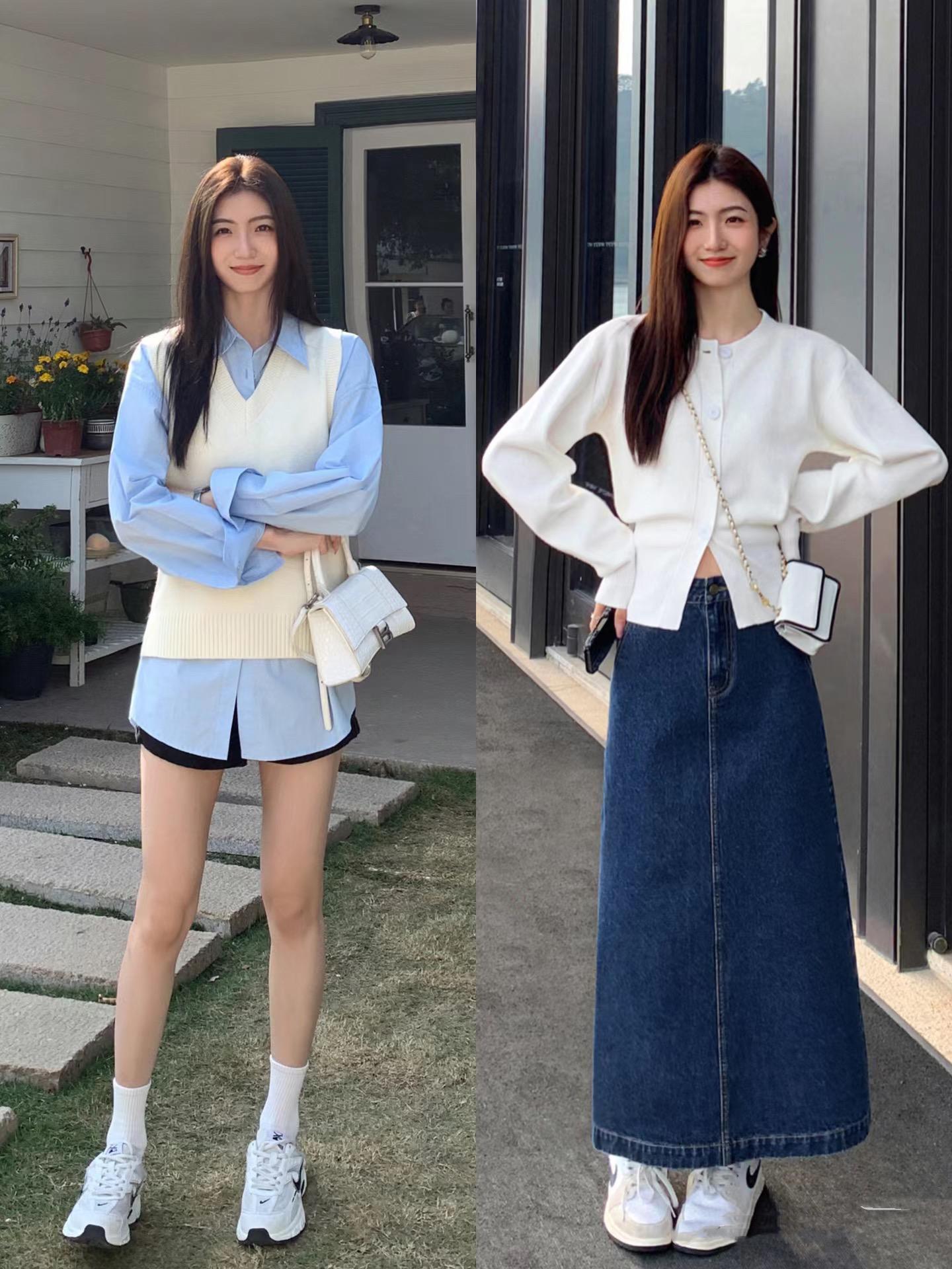 淺藍色的襯衫,搭一件白色針織馬甲,就是又甜又酷的韓系辣妹風。