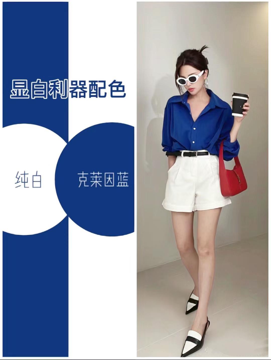 最顯白的配色,一定是純白色+克萊因藍。克萊因藍亮度、飽和度都很高,屬於不挑膚色的萬能顯白色。