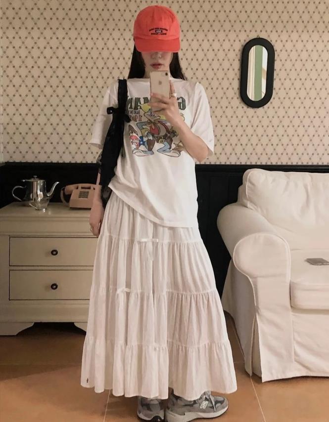一身乾淨的白色系穿搭,看起來也太清爽好看了,白色短袖t恤和白色半身長裙,鬆弛感十足的一套,上衣是一件白色印花短袖t恤,簡約又不失個性,盡顯休閒慵懶範。頭上佩戴一頂亮色棒球帽,很洋氣吸睛。