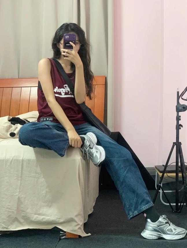 慵懶感十足的夏日穿搭,牛仔闊腿褲+老爹鞋,真的是既休閒舒適又減齡,上衣可以配短袖t恤,或者是大背心等,很舒適鬆弛感的打扮,可太舒服自在了。