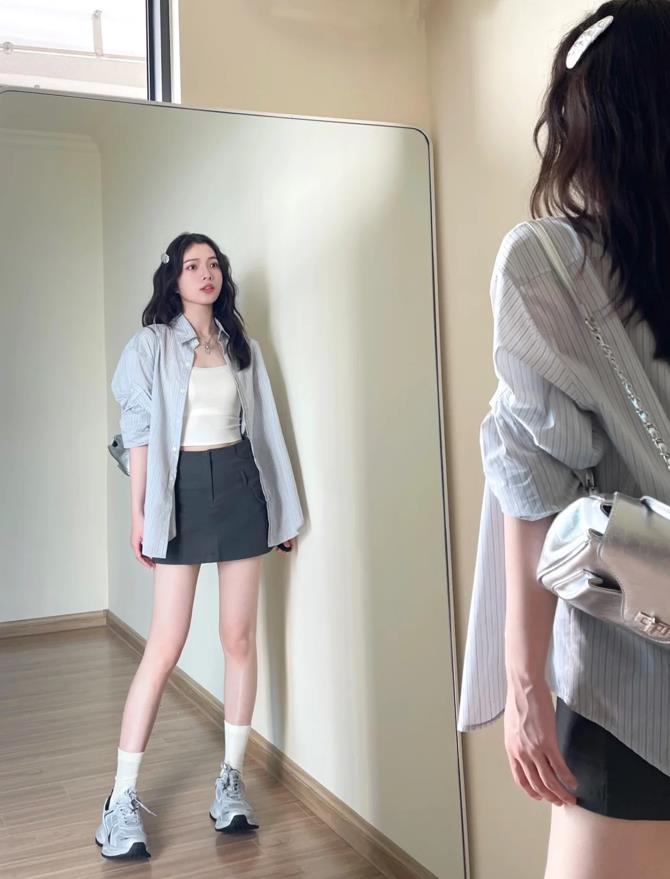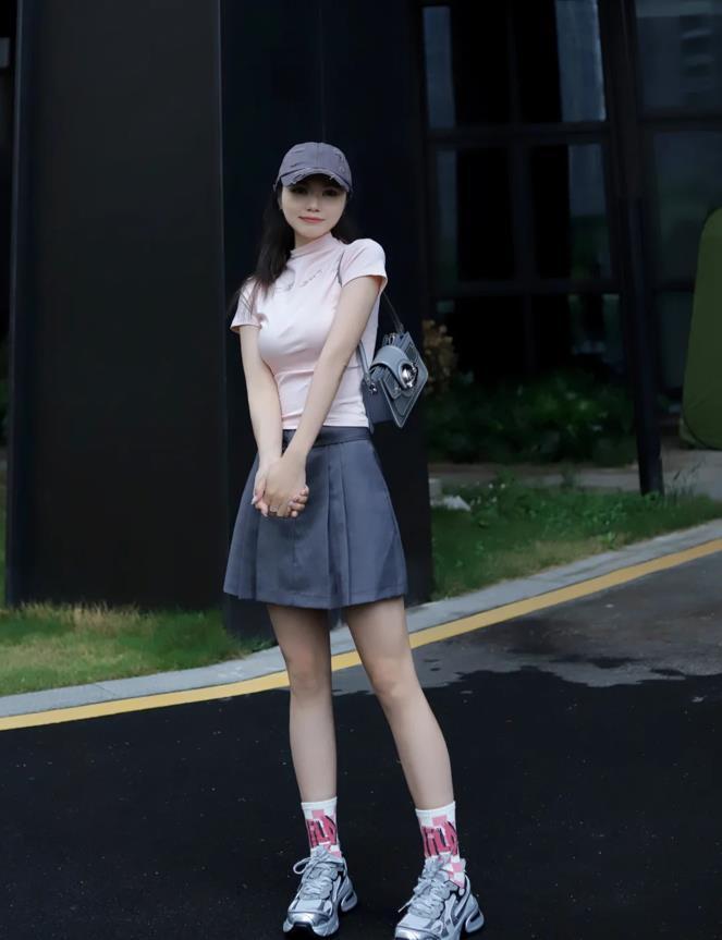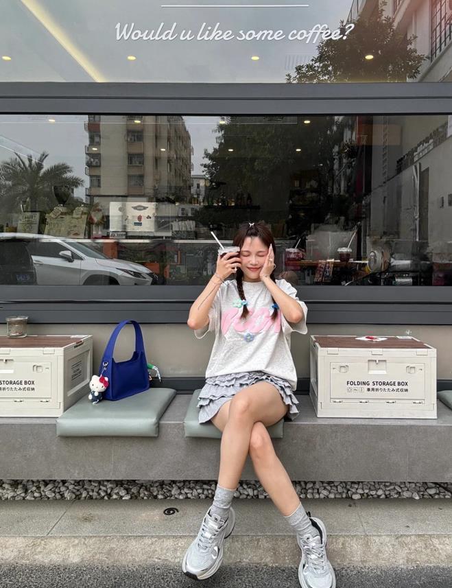 T恤短裙配老爹鞋,一整個韓範十足,喜歡這種減齡又充滿少女風裝扮的女生,就不妨借鑑起來咯,寬鬆的大t恤,下裝是一條蛋糕半身短裙,老爹鞋的加入,休閒中又帶點韓系甜美的既視感。