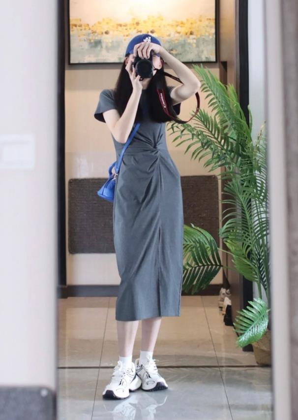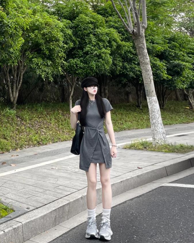 灰色收腰連衣裙,穿起來一秒就打造出小蠻腰,關鍵是顯瘦,選擇一雙老爹鞋來配,夏天就這麼穿吧,特別是150的小個子女生,這樣穿很顯腿長和顯高挑。