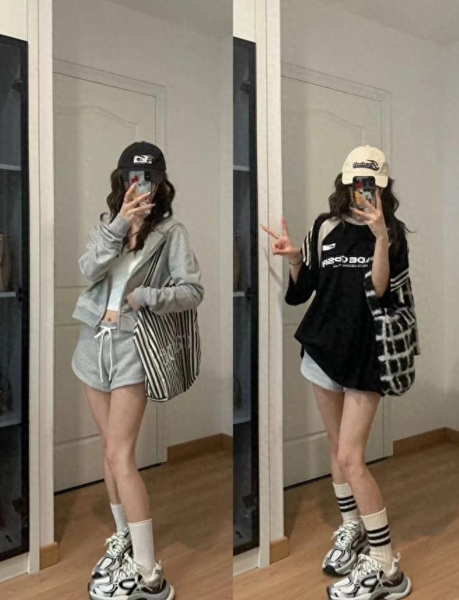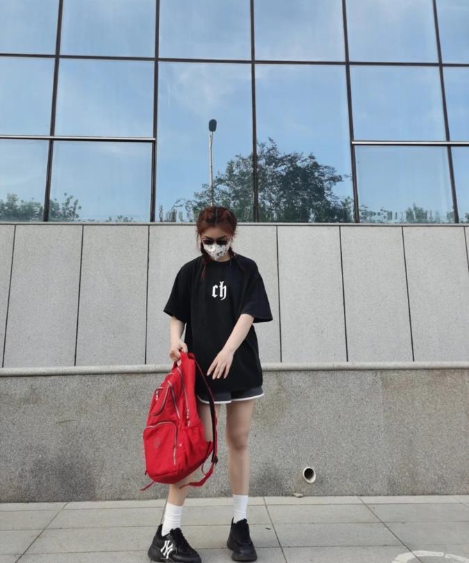 黑色短袖t恤,雖然在夏季裏穿上會有些顯沉悶,但顯瘦是真的,搭配一條運動短褲,腳下的老爹鞋是黑色的,和t恤顏色一致,這樣的穿搭配色就是和諧。小個子女生說什麼也要試試這樣穿,超級顯腿長的。
