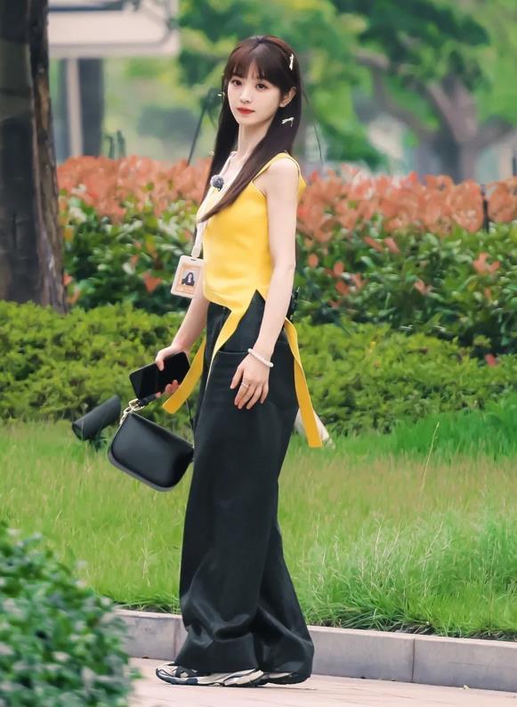田曦薇真的是甜美一個啊,她的這套穿搭活力滿滿,黃色小吊帶+黑色闊腿褲,腳上是一雙拼色老爹鞋,夏天這樣穿就很不錯,多巴胺滿滿的。