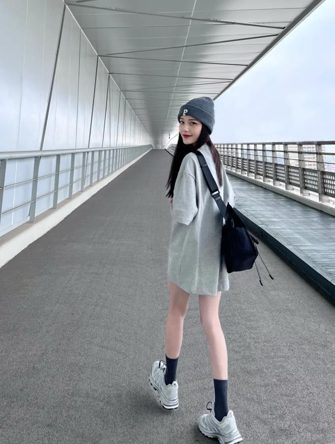 一條灰色系的連衣裙,腰身上面帶點皺褶感,裙子的細節還是做得蠻不錯的,搭配增高的老爹鞋,再加上一個藍色包包和帽子,輕鬆點亮了整個穿搭。鞋子穿起來舒適度可讚了,腳感也非常好。