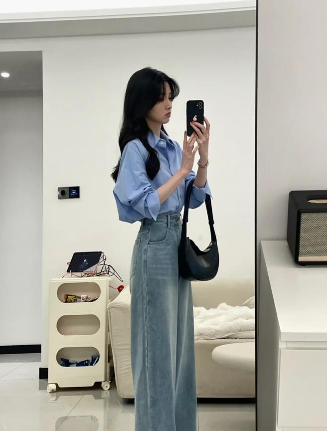 好看的藍色襯衫,真的怎麼都看不膩呢,很清爽百搭的一個色調,可以把膚色襯托得十分白皙,基礎簡約款,可以與任何一種下裝相配。想要減少襯衫帶來的嚴謹和正式,選擇一條牛仔褲來配就可以,垂墜感十足,加上寬鬆版型的褲子,可顯瘦藏肉了。