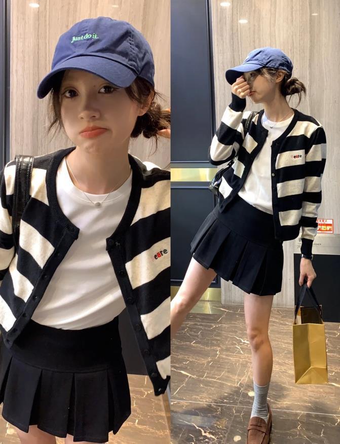 充滿韓範的一身穿搭,很不失日常和舒適,初秋季節就可以借鑑起來,黑白條紋針織開衫,是小短款的長度,小個子女生能輕鬆駕馭起來。內搭白色短袖t恤+黑色百褶短裙,青春又充滿活力,減齡效果真的很不錯。