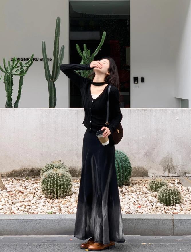 下身搭配一條黑色半身魚尾長裙,把下身襯得很纖細,還不失優雅氣質。