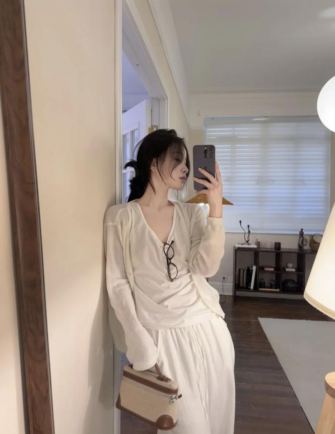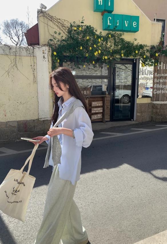 真的非常喜歡韓女的穿搭,寬鬆基礎款長袖襯衫,搭配利落剪裁的亞麻長褲,再加上一件氛圍感十足的小披肩,這麼一整套下來,鬆弛感十足。配色很乾淨和諧,韓系的氛圍感信手拈來。