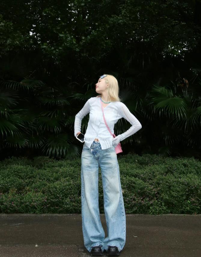 內搭白色短袖t恤和牛仔拖地褲,腳下踩着一雙白色運動鞋,可太休閒舒適和隨性了。