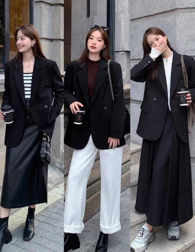韓系通勤範十足的一套穿搭,職場的女性們可以這樣穿,當然了,在日常逛街或者是約會時,也可以借鑑起來。黑色的西裝外套,一年四季都不會出錯,寬度適中的版型,穿得舒適自在,還非常顯瘦。