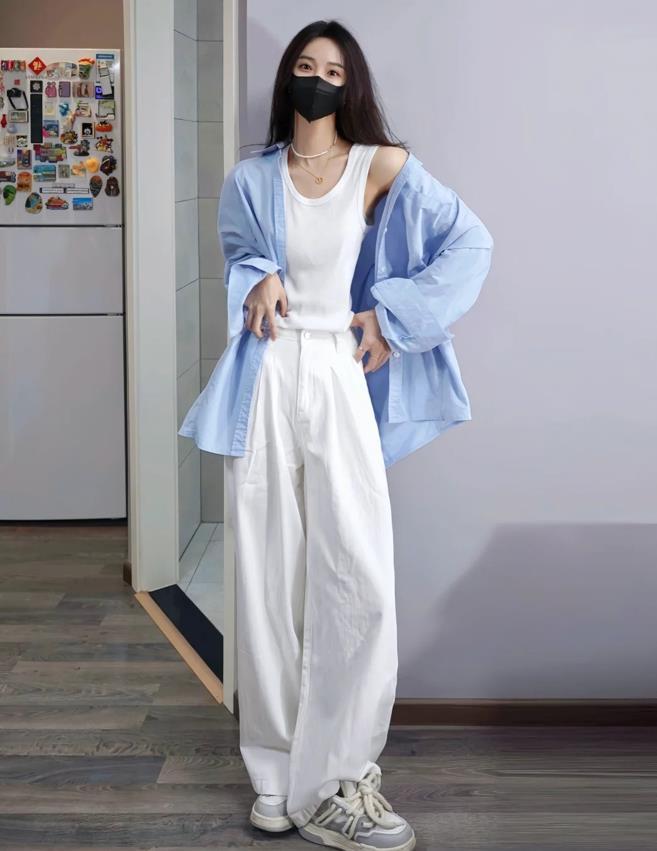 藍色長袖襯衫,在夏季和秋天都可以穿,現在這個季節,出門可以直接當作防曬衫來穿,裏面配一件白色背心,藍白搭配,實在是太清爽和乾淨了。