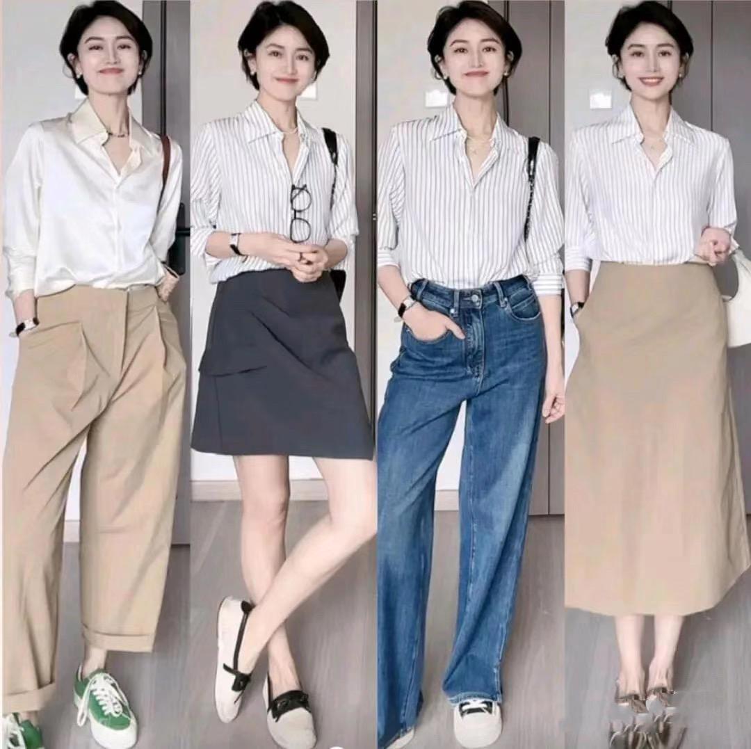 這種款式基礎的襯衫,可以搭配半身裙、高腰褲,基礎單品的疊搭,只需要解開襯衫的領口、或者配文藝風眼鏡、酷颯耳環都更洋氣。