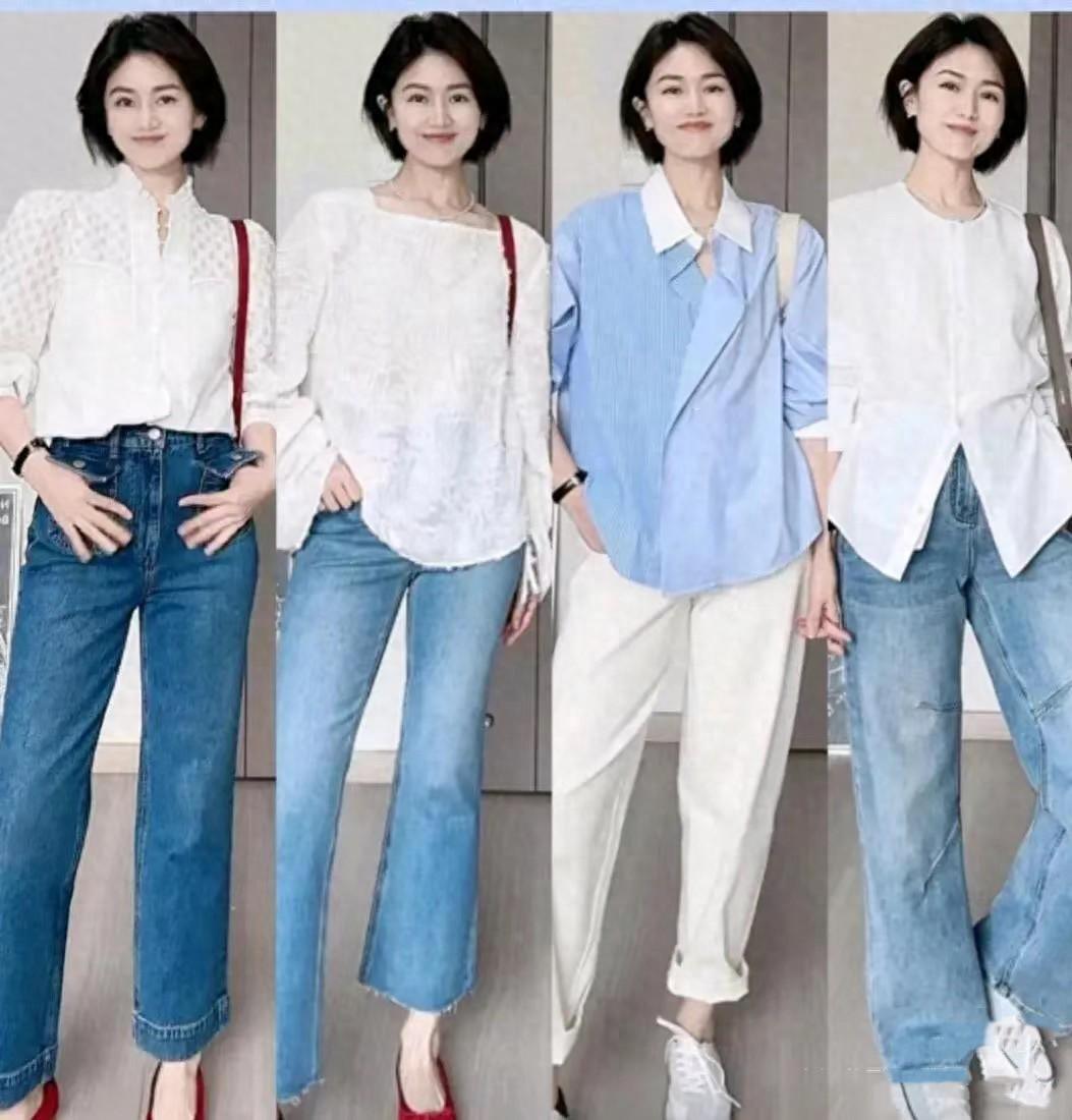 像時裝風的白襯衫、或者個性一點的藍色襯衫,都可以給款式簡潔的直筒牛仔褲。時髦款+基礎款,也是很高級的組合方式。