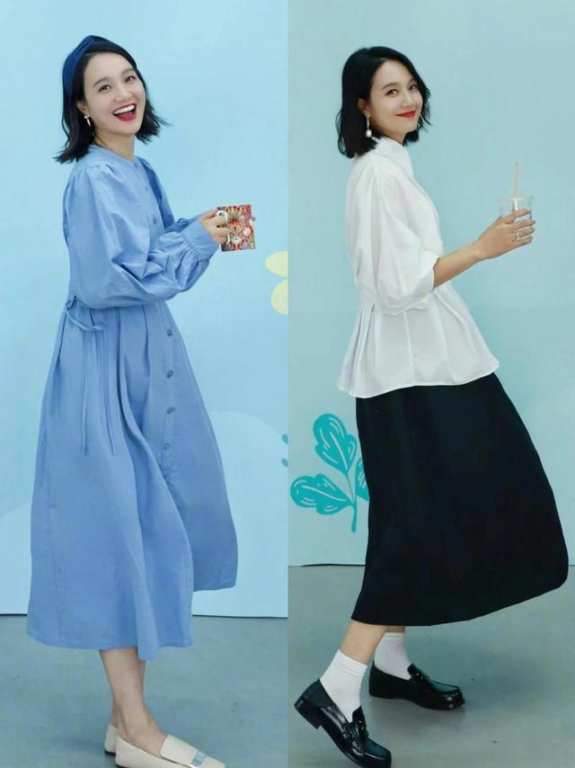 另外,在搭配方面,樂福鞋也沒有太多的要求,像朱丹“藍色連衣裙”、“白色上衣+黑色半身裙”這兩身穿搭造型,便足以體現出樂福鞋百搭的一面。