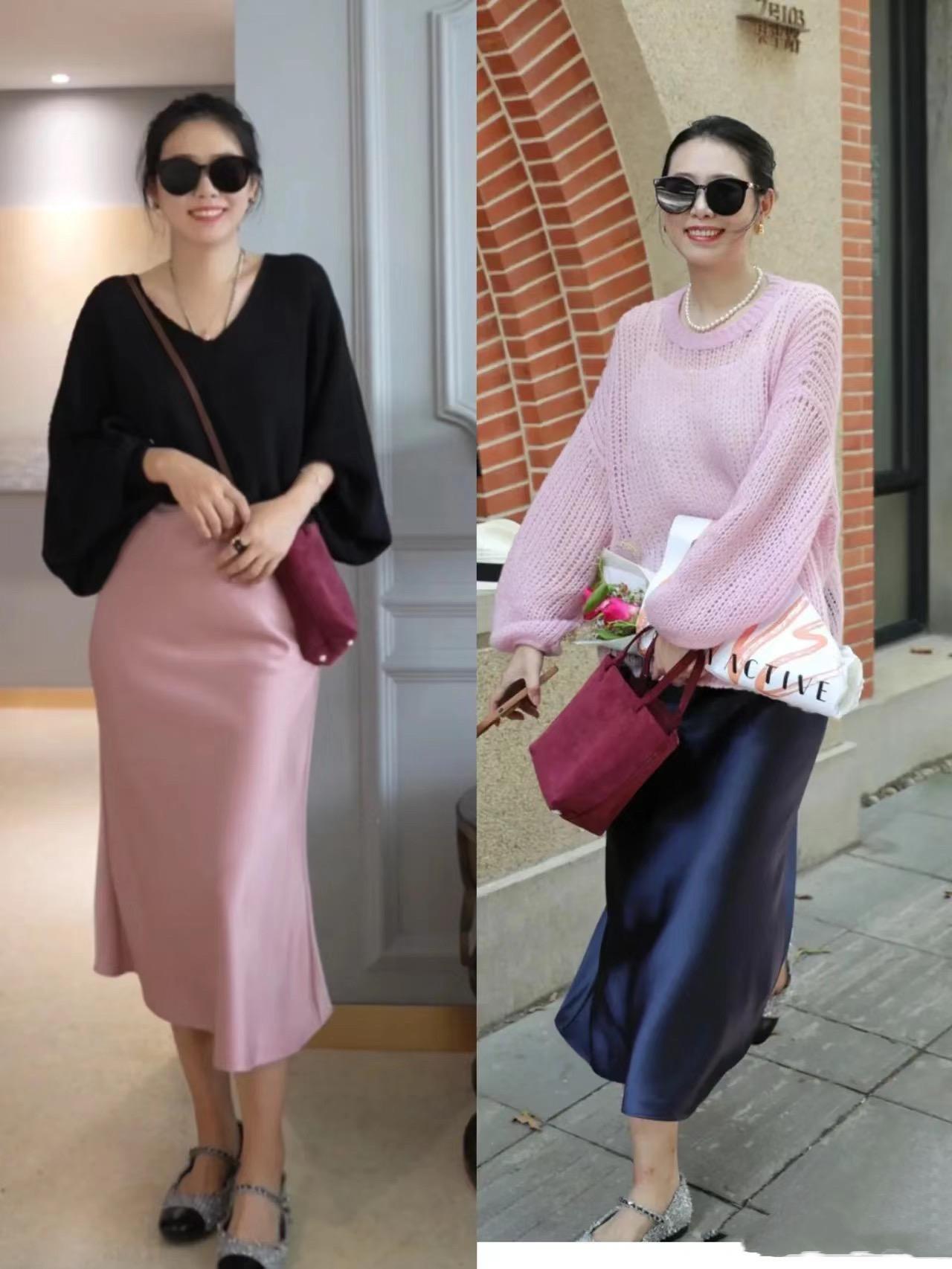 如果夏天裏的醋酸半身裙還沒來得及收起來,那麼就搭配軟糯溫柔的針織衫來穿着吧。
