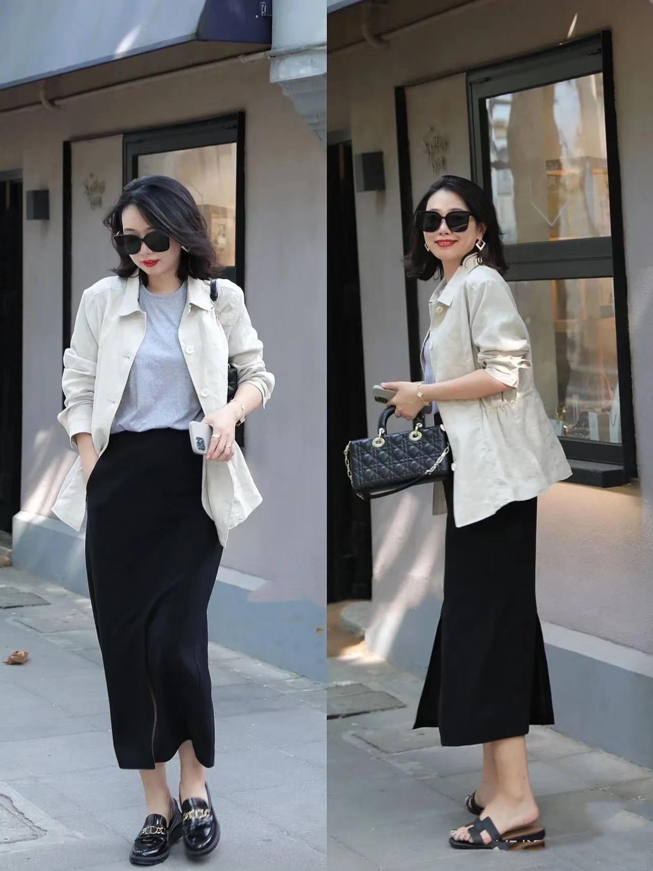 基礎款的T恤+直筒半身裙,要怎麼穿才更洋氣?有時候只需要疊搭一件寬鬆馬甲就夠了。
