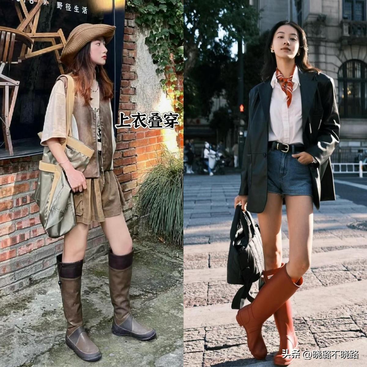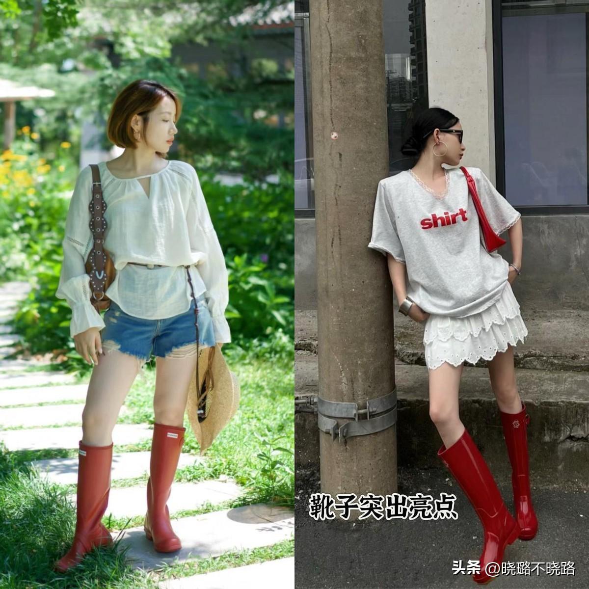 上衣疊穿的方式,和雨靴的匹配度也很高,基礎款的T恤襯衫,疊穿馬甲或者西裝,再搭配一條短褲,時尚感拉滿。