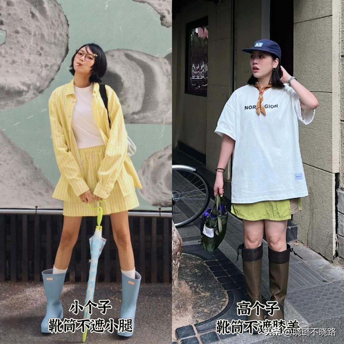 一雙雨靴的挑選,可以直接體現出你的品位,小個子挑選雨靴的時候,靴筒高度別超過小腿,遮住腳踝的短靴,或者露一半小腿的中筒靴,在視覺上更顯腿長。