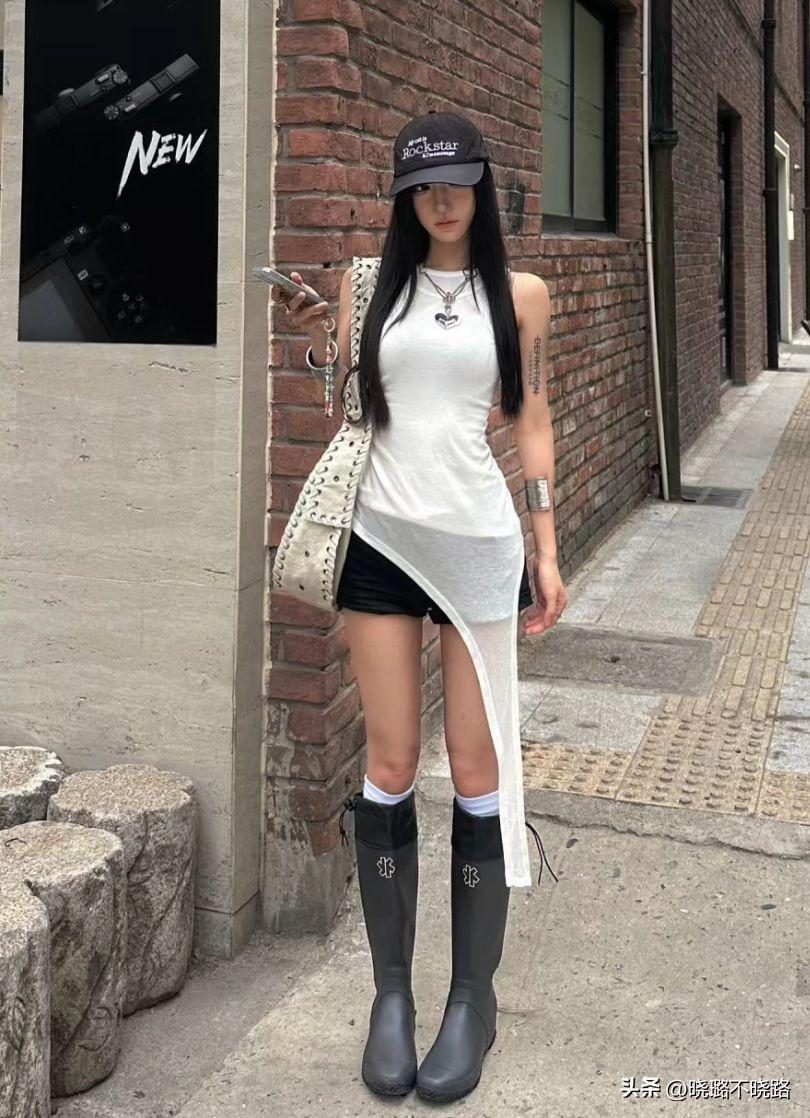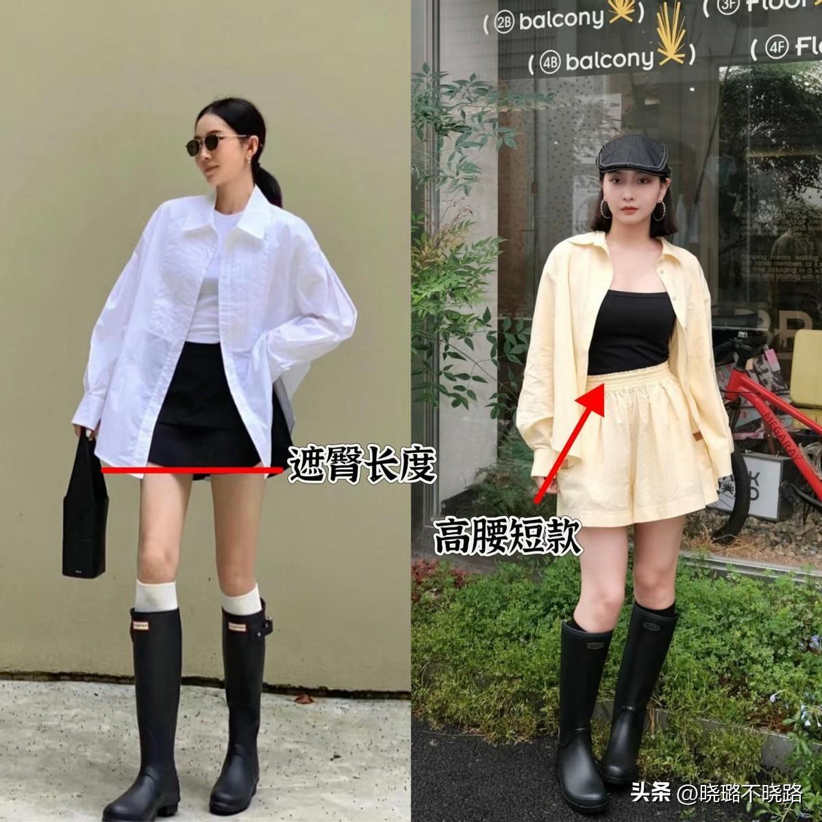 想要讓你的雨靴造型看上去更高級,就一定要用對正確的穿搭技巧,例如,下身失蹤就很符合雨靴的穿搭條件,選擇短褲短裙+遮臀外套進行組合,露出大腿更顯高。