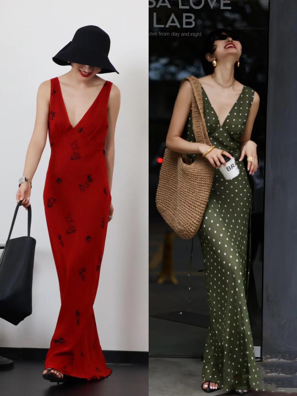 一條大V領的及踝長裙,溫柔浪漫中帶着小性感。包裹腰身曲線的剪裁,舉手投足間盡是風情。
