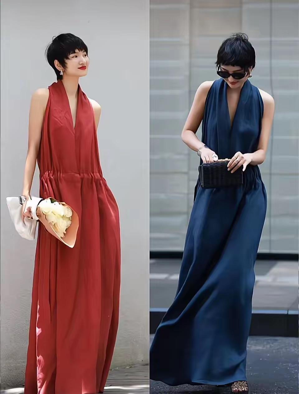 直角肩、小V領、自然的打褶設計,更多了浪漫姿態。寬鬆的長裙,自然鬆弛的腰線,包容性也更強,有點發福的小肚子,都可以在掛脖長裙下自然掩蓋。