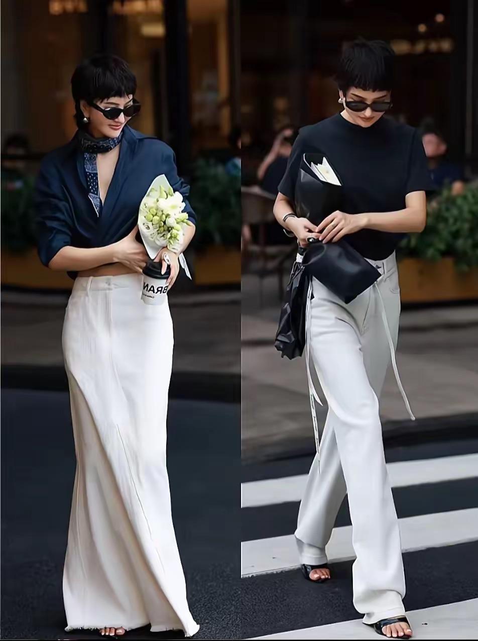 西裝褲、牛仔褲、闊腿褲,在秋日街頭都是非常時尚的單品。白色的闊腿褲,色彩清爽、酷颯又醒目。
