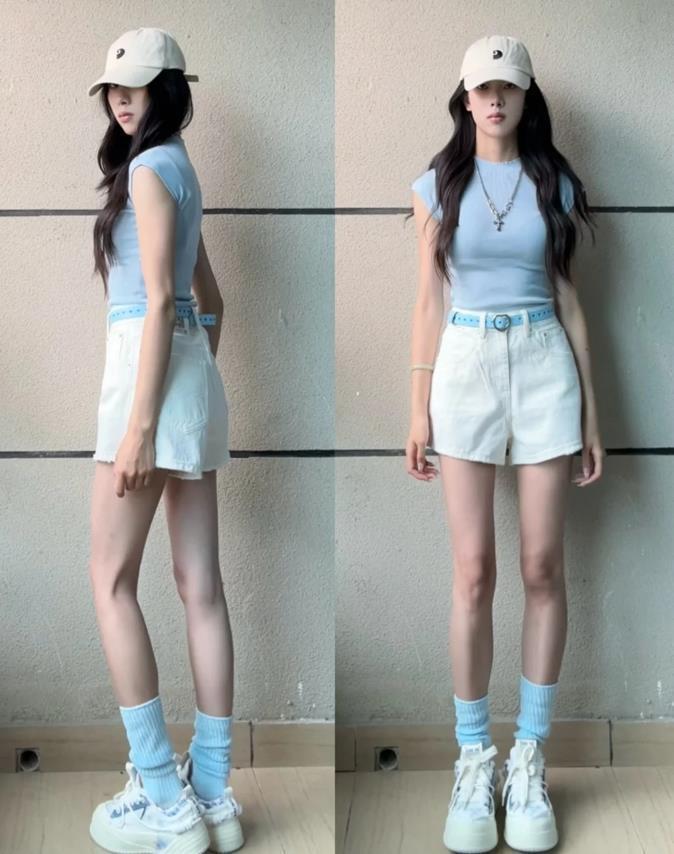 白色和藍色的組合,那就是最適合夏天的了,在這個夏天,誰的衣櫥裏會沒有一條百搭的白色短褲呢?與淡藍色打底短袖相配,整個顏色一點都不會顯沉悶,日常又不挑人。