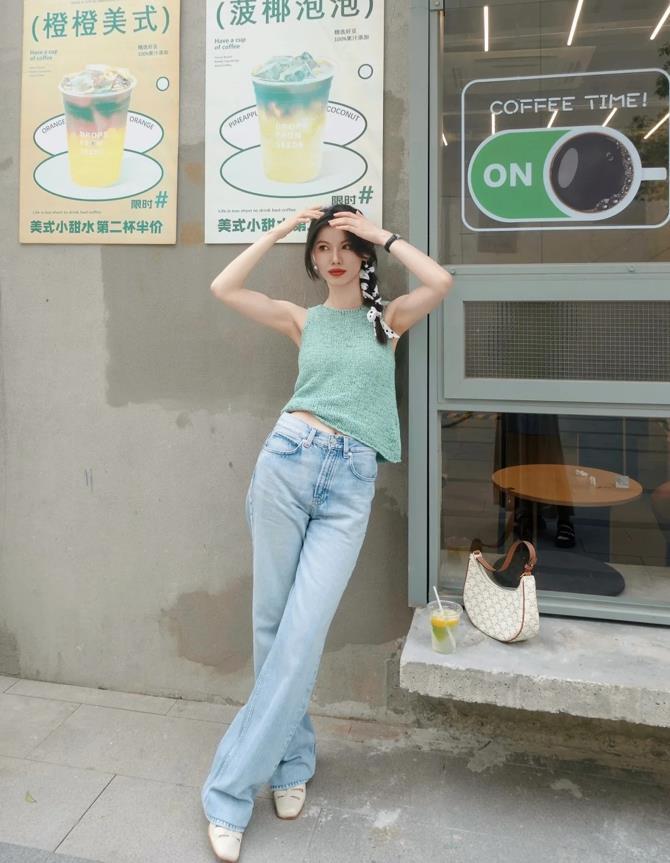 很清新又充滿活力的顏色,薄荷曼波綠無袖背心,下裝簡單搭個牛仔褲,就很輕盈舒適了,整個穿搭很簡約大方,去繁就簡,正是適合夏天的穿搭,雖然一整套沒有過多的裝飾,卻能讓人眼前一亮。
