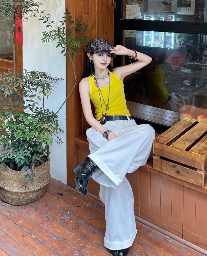 對於這個檸檬黃色,真的是無法拒絕啊,特別是現在這個夏季,穿上這麼一個顏色,我覺得就是非常合適。簡單的檸檬黃背心,搭配白色闊腿長褲,一緊一鬆的組合,也太修飾身材和顯瘦了。