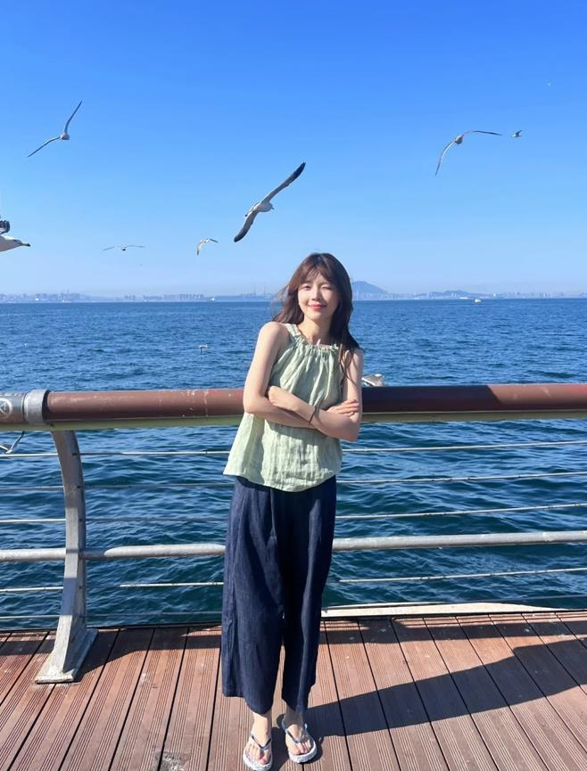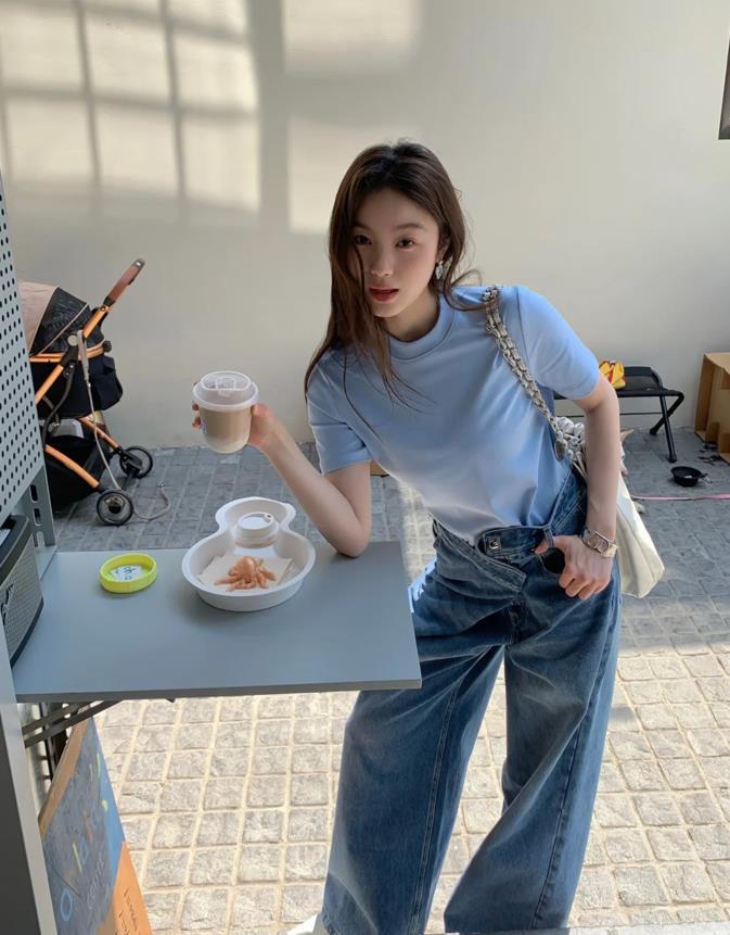 藍色真的是能給人帶來好心情啊,況且還是這種低飽和度的藍色,很襯膚色和顯白,簡約款的藍色短袖t恤,穿得舒服自在的同時,又很百搭。選擇一條牛仔闊腿褲來配,真的太藏肉顯瘦了。