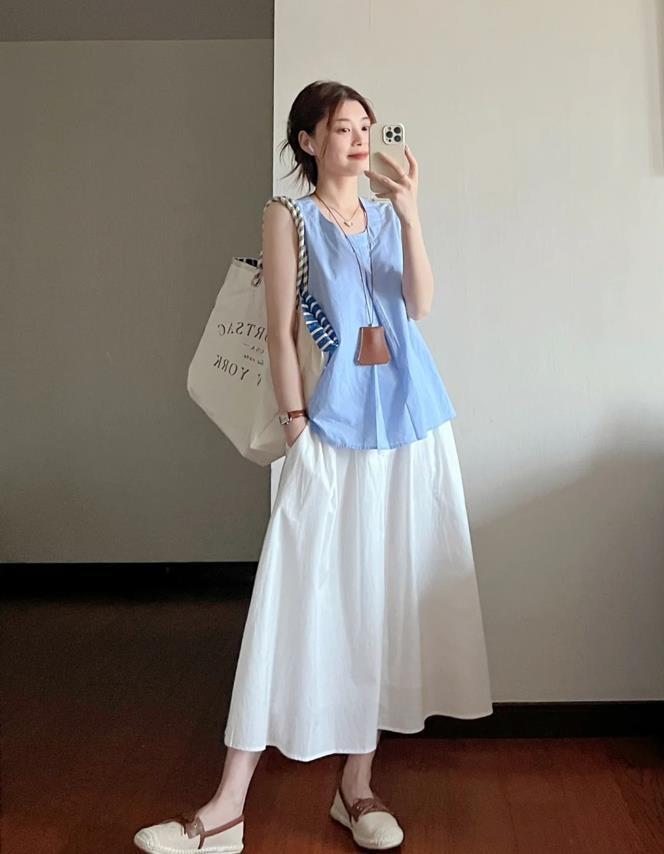 鬆弛感的穿搭,實在是太愛了,特別是面對如此高溫炎熱的天氣,誰還願意穿得過於束縛感十足呢?當然是寬鬆一些纔好啊,藍色無袖衫和白色半身長裙的搭配,上下都是寬鬆的版型,可太舒適自在和顯瘦了。