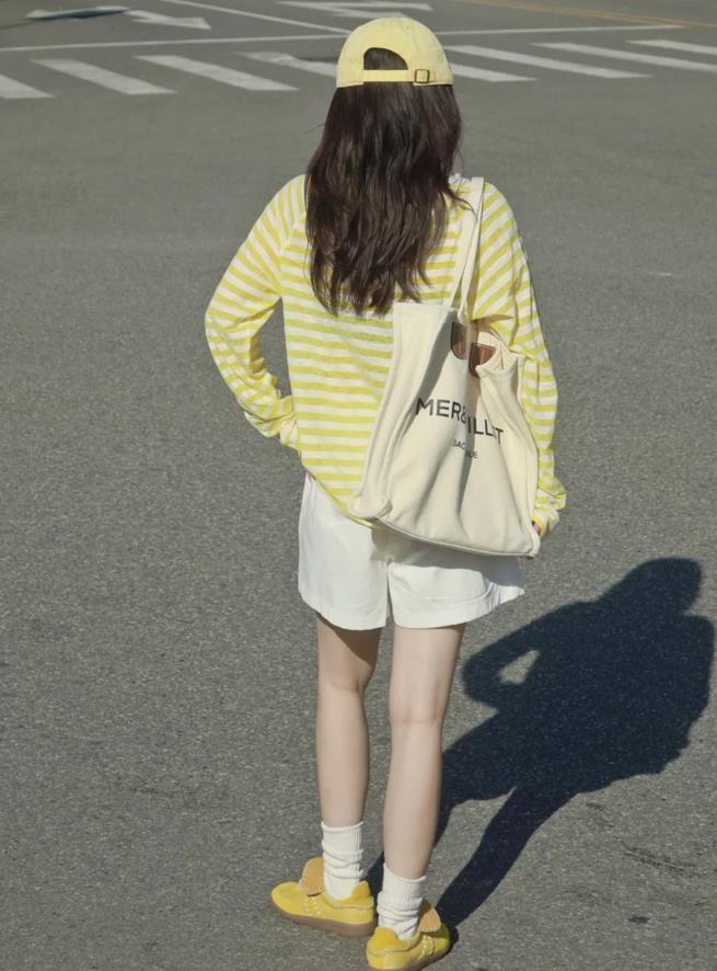 這一套穿搭是海鹽檸檬味的,不得不說的是,檸檬黃色真的太適合夏天了,低飽和度的顏色,對於膚色暗沉的姐妹也沒有一點影響,反而是能把膚色襯托得很白皙。選擇與白色、黑色相配,就很好看。